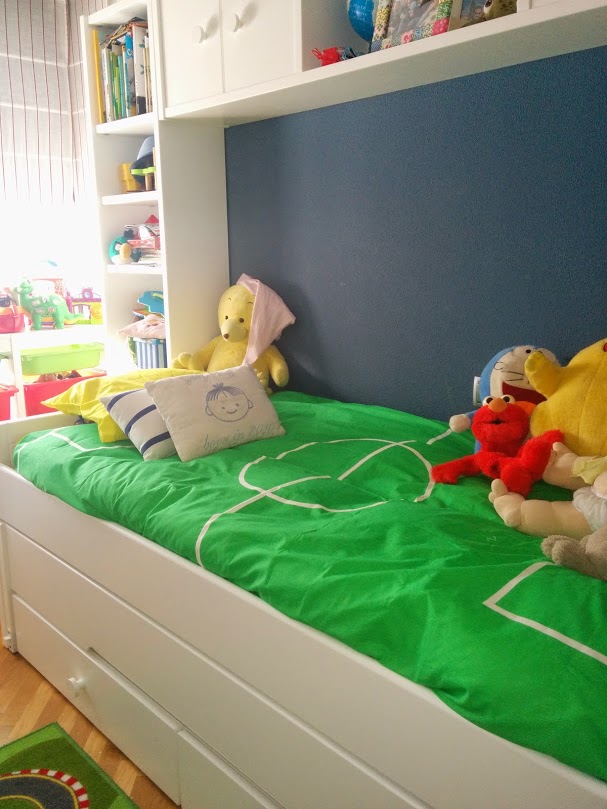 ¿Y cómo ha ido el cambio? Pues estupendamente bien. Los pequeños estaban encantados en sus camas de mayores y ante los celos previstos de Diego, me anticipé comprando una funda para su silla del coche exactamente igual que la de sus hermanos y, para su habitación, unas sábanas de fútbol muy molonas de niño mayor. Así que, aunque ha preguntado por qué él no tiene habitación nueva, ha protestado poco al ver sus sábanas molonas.