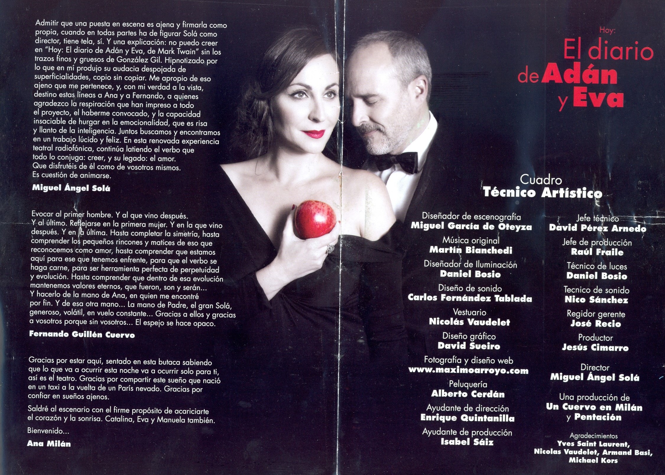 No. No se me escapa que mañana es 14 de febrero. San Valentín. Y aunque ya sabes que no somos de celebrarlo, hoy te voy a recomendar una obra tierna hasta decir basta que sacó mis lágrimas y que me pareció preciosa en su sencillez. No sé si quedan entradas o si tienes la oportunidad de acercarte; pero si puedes te recomiendo que veas «Hoy: el diario de Adán y Eva». Con la radio de fondo en dos épocas diferentes, abarca un tema universal: el amor. No, ¡qué narices!: el AMOR. Amor: «palabra inventada por Eva para explicar lo inexplicable». Cuando la vi, provocó en mí una sensación de ternura increíble. De paz, tal vez. Precioso texto al que aún hoy sigo dando vueltas hasta el punto que estoy pensando ponerme en contacto con la productora para ver dónde puedo conseguirlo. Me gustaría leerlo. Me encanta leer teatro y creo que el texto merece ser releído. Reconozco que me metí en la obra. No sé si tal vez demasiado (¿existe «demasiado» cuando vives tanto una obra de teatro?). Hacia la mitad ya Guillén Cuervo me emocionó, pero al final exploté en lágrimas.
